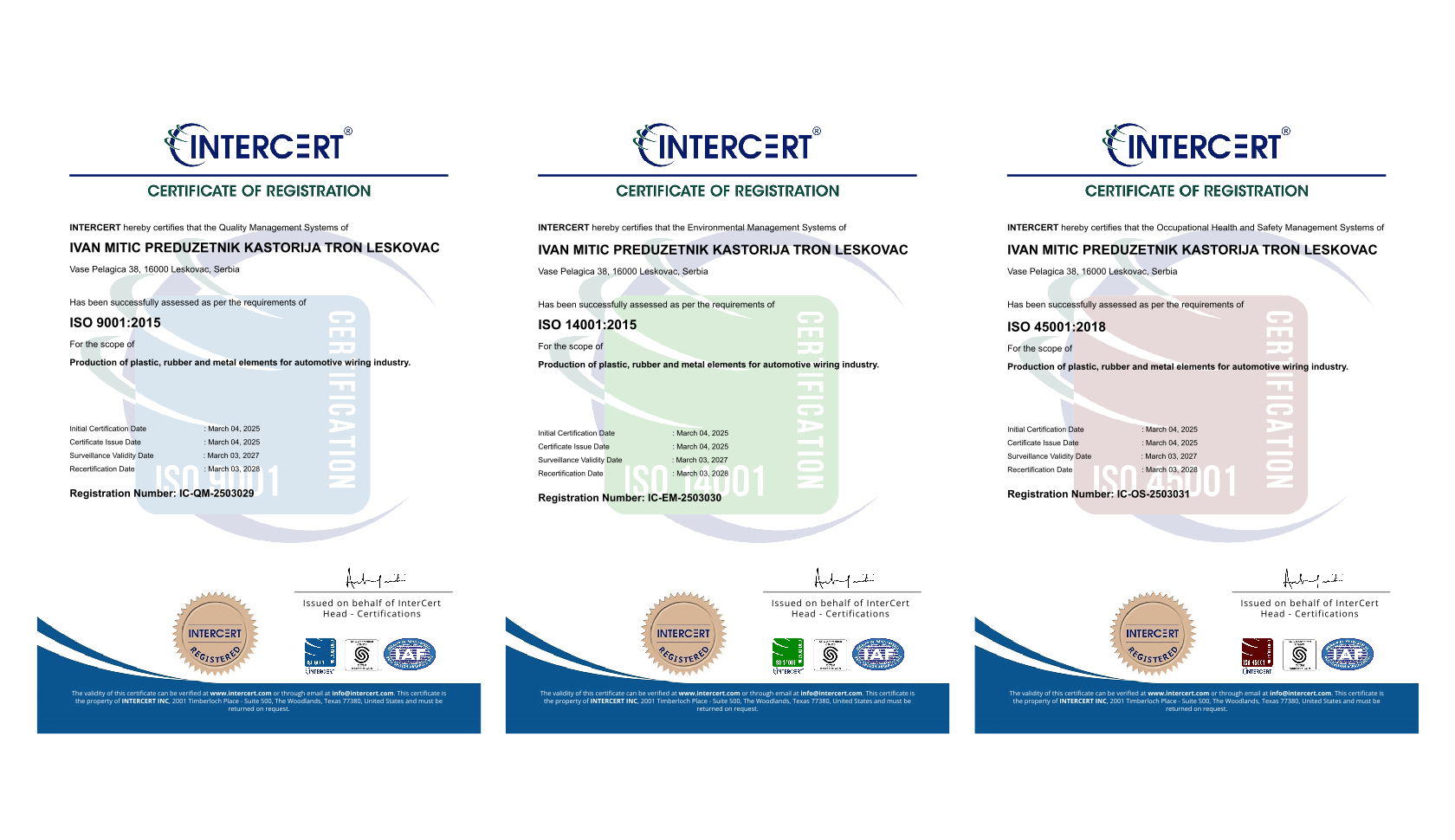 Sistem upravljanja u našoj kompaniji usklađen je sa sledećim međunarodnim standardima: